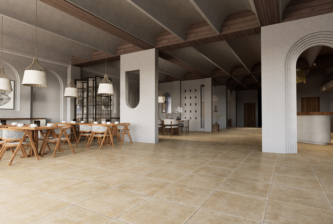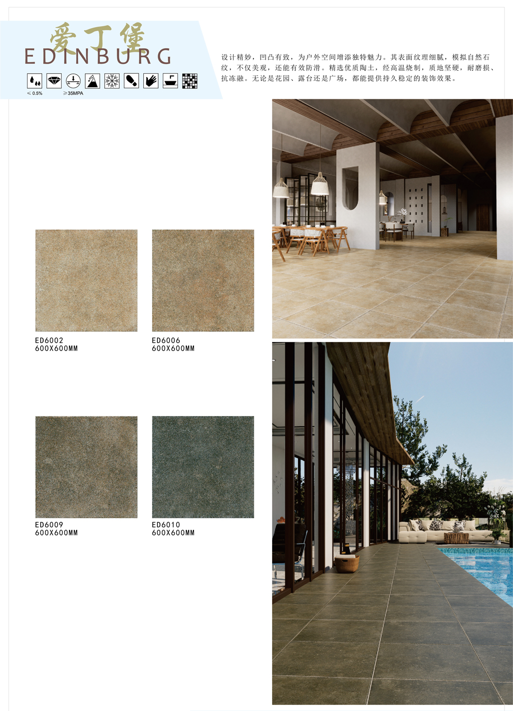 铺贴场所:庭院、客、餐厅、卫浴间地面