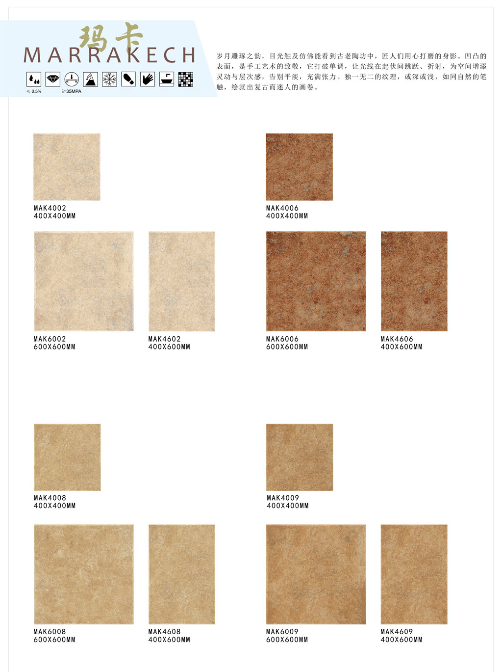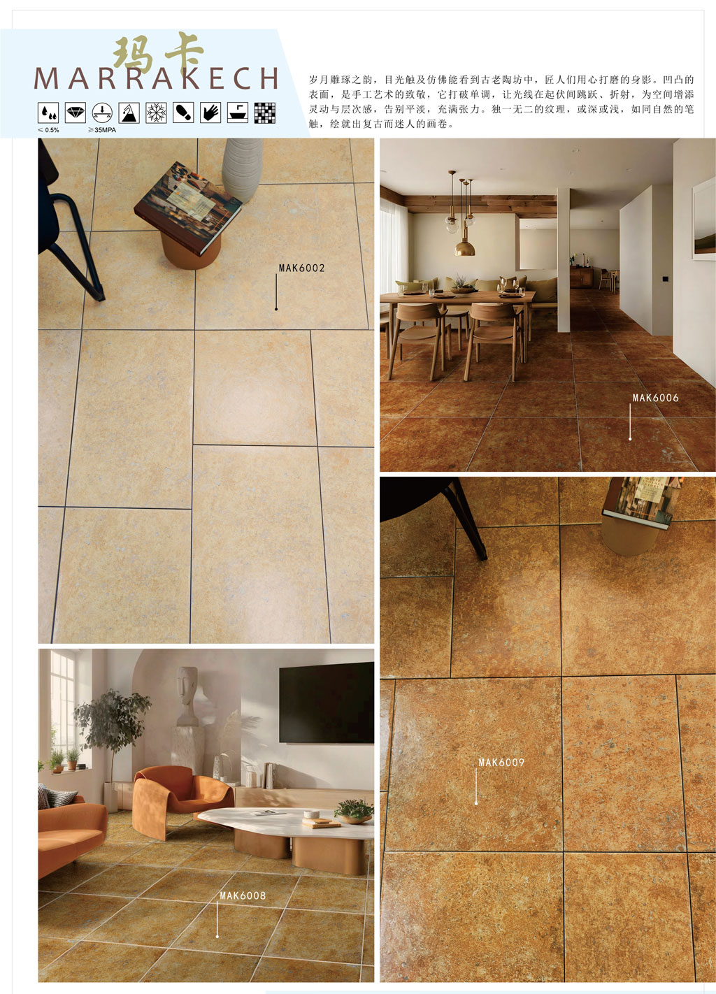 铺贴场所:庭院、客、餐厅、卫浴间地面
