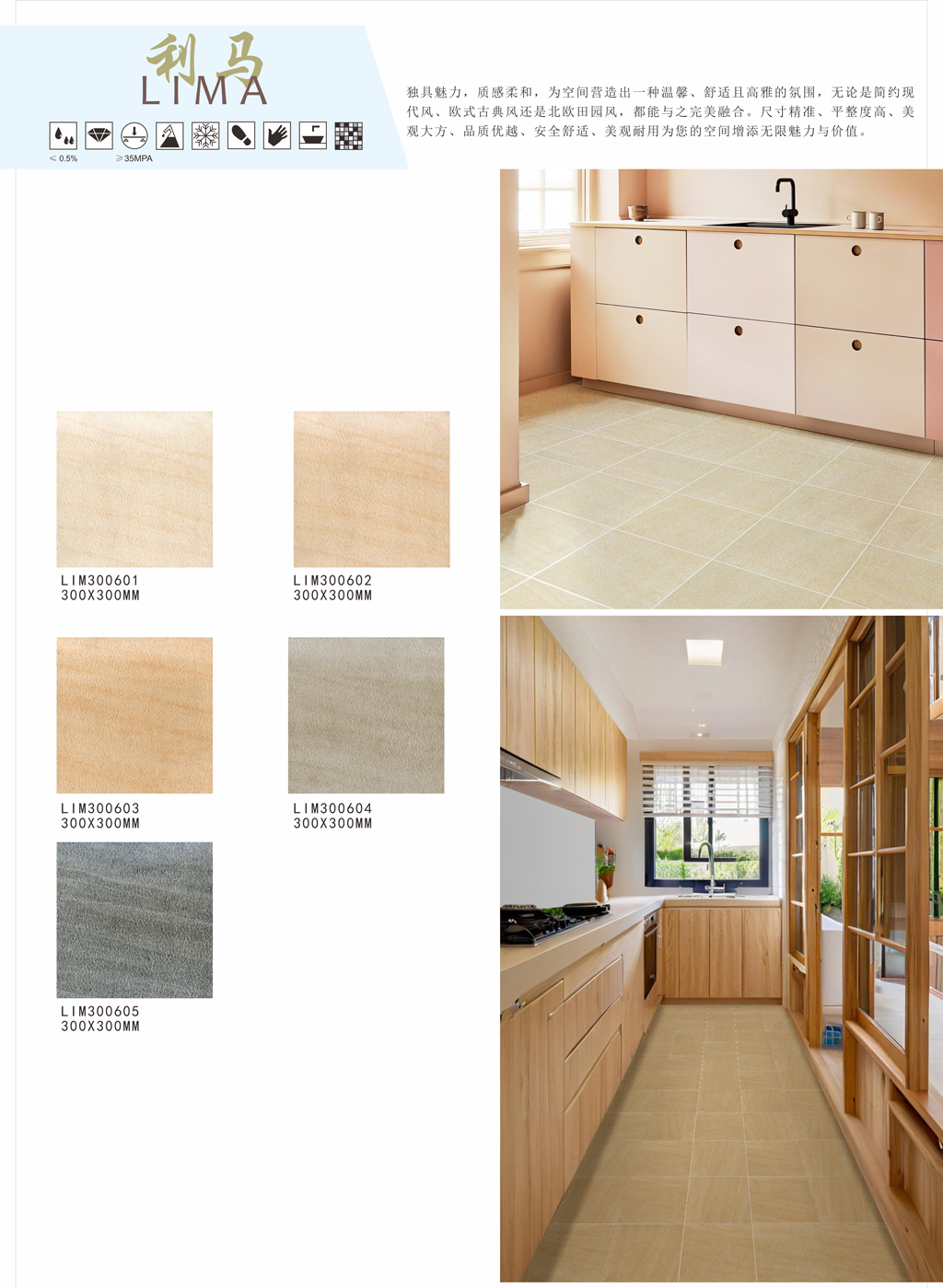 铺贴场所:庭院、客、餐厅、卫浴间地面